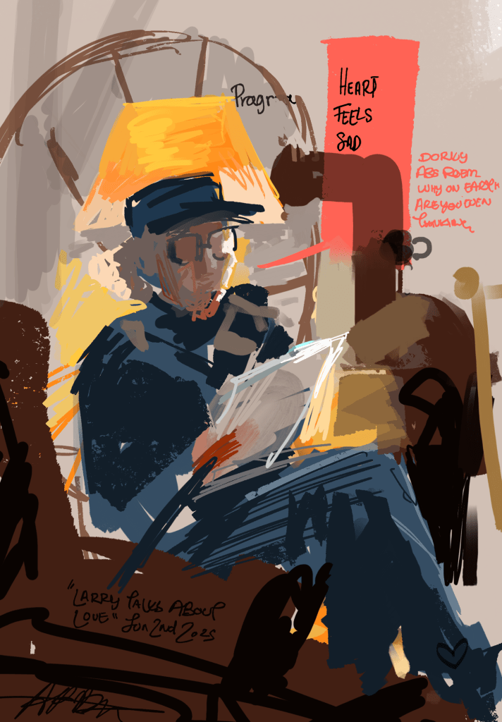 Artwork Recent Artworks “One Sided Conversation,” 24×30” Oil on canvas, 2025 “Me and Tippy,” 6×6,” Oil on canvas. 2025 Dia De Muertos Postcard, 2024, Done using Procreate. “JM Painting” 115 min “Kristopher’s” 20 min “Larry Talks About Love” 30 min Procreate Quick Studies