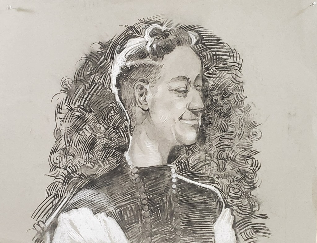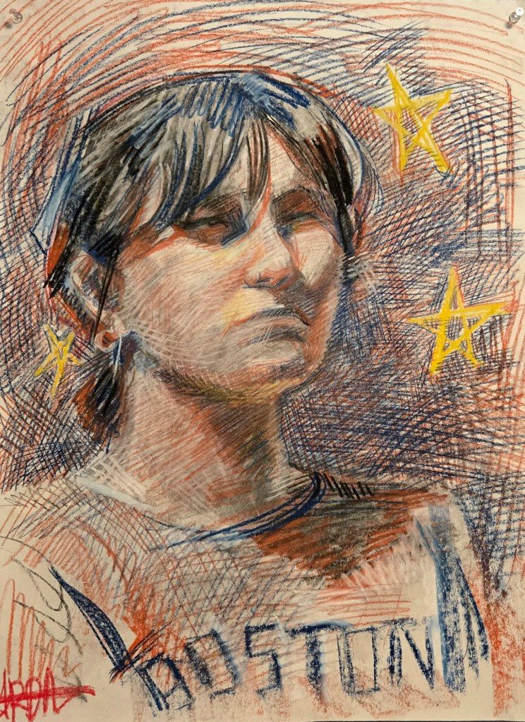 “You’re at the Party,” Pastel on paper, 2024“Jamie,” Ink on paper, 2023“One Sided Conversation,” 24×30” Oil on canvas, 2024-25“Not Patriotic,” Pastel on paper, 2024