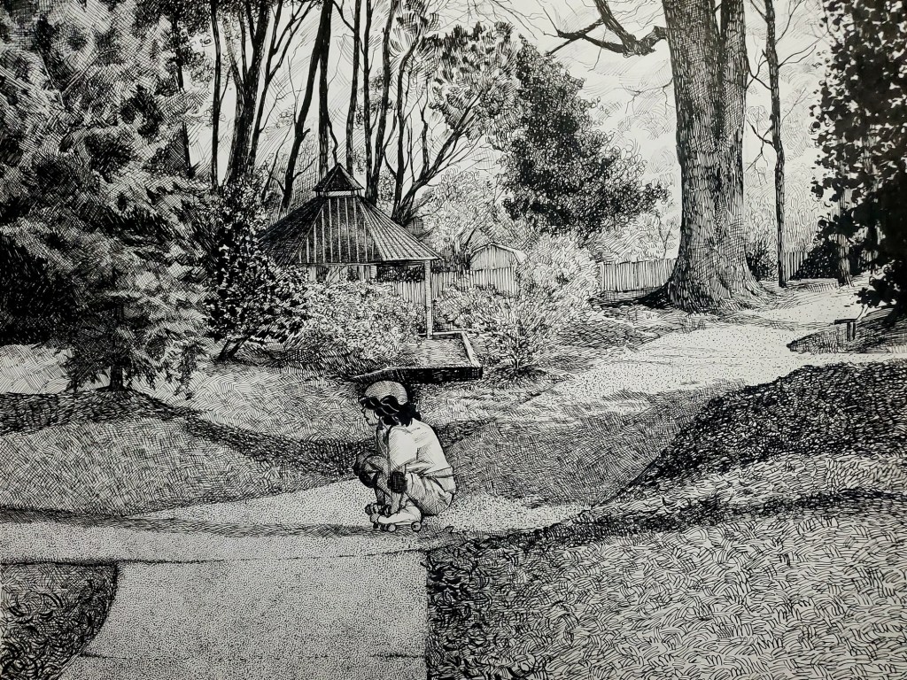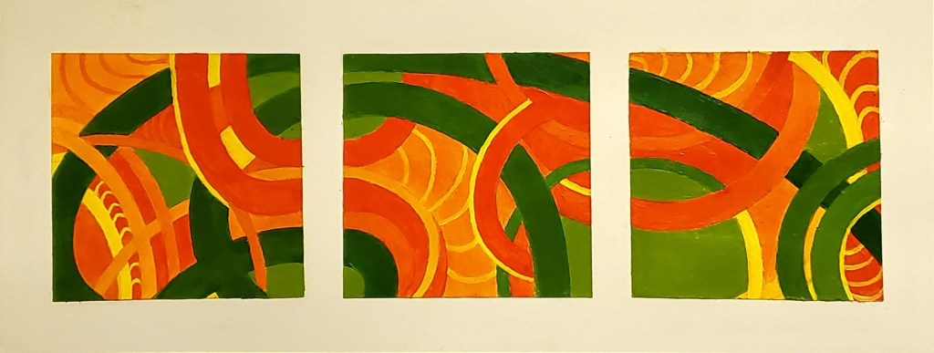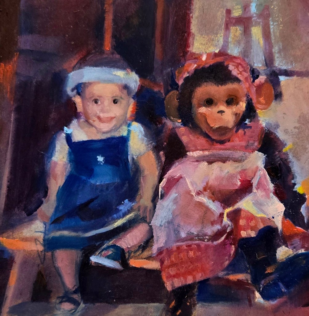 “Tippy and Me,” 6×6, Oil on Canvas, 2025“Not Blue Yet,” White Conte and Charcoal on paper, 2023“Peppers,” Acrylic on bristol, 2023“Outdated Ruler,” Ink on paper, 2023